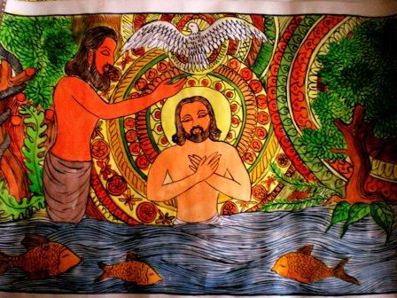 The picture reflecting Jesus baptism, is it not predicting the wrong message> If we look at Mathew Mark Luke we see that the Holy Spirit rested upon when Jesus left the water onto dry land? The Holy Spirit came upon Jesus when HE left the water?