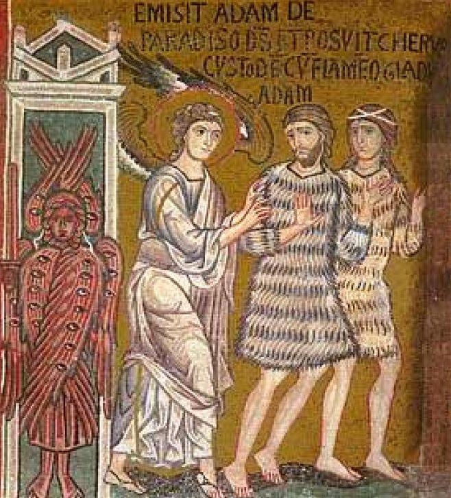 A medieval illustration of Adam and Eve dressed in animal skins as they are expelled from the Garden of Eden. The Latin text at the top is a paraphrase of the statement in Genesis that the first pair left the Garden, which was then guarded by an angel with a flaming sword.